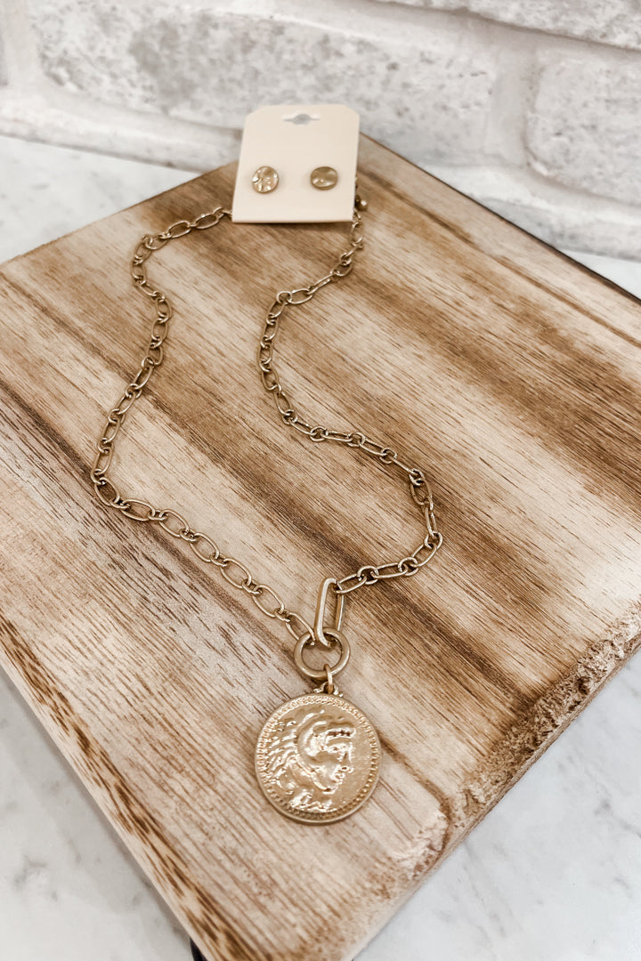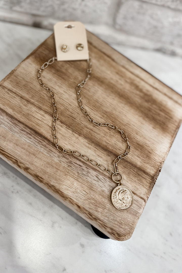 18 inch gold chain necklace with coin charm and gold circle stud earrings.