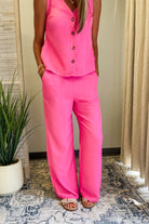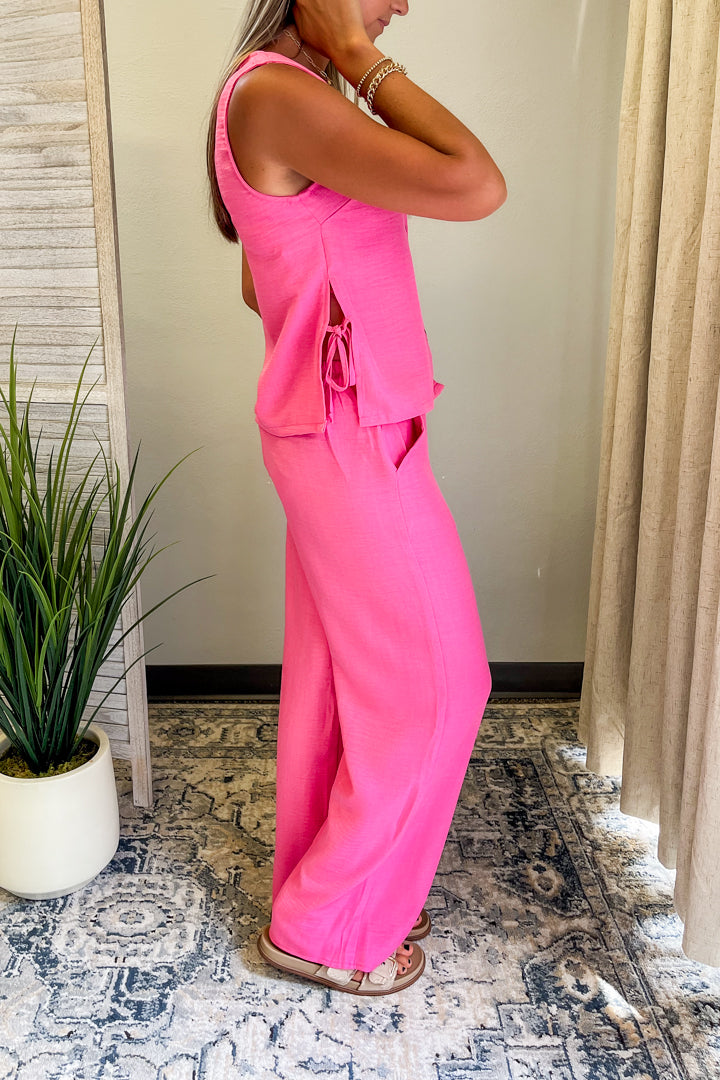 The sleeveless vest boasts a flirty V-neckline, button-down front, and cute side ties that let you customize your look. Paired with breezy, high-waisted wide-leg pants, this set keeps you comfy and stylish all day long. Perfect for sunny days or casual nights out, it’s your go-to for effortless chic—just add your favorite shoes and let the fun begin!