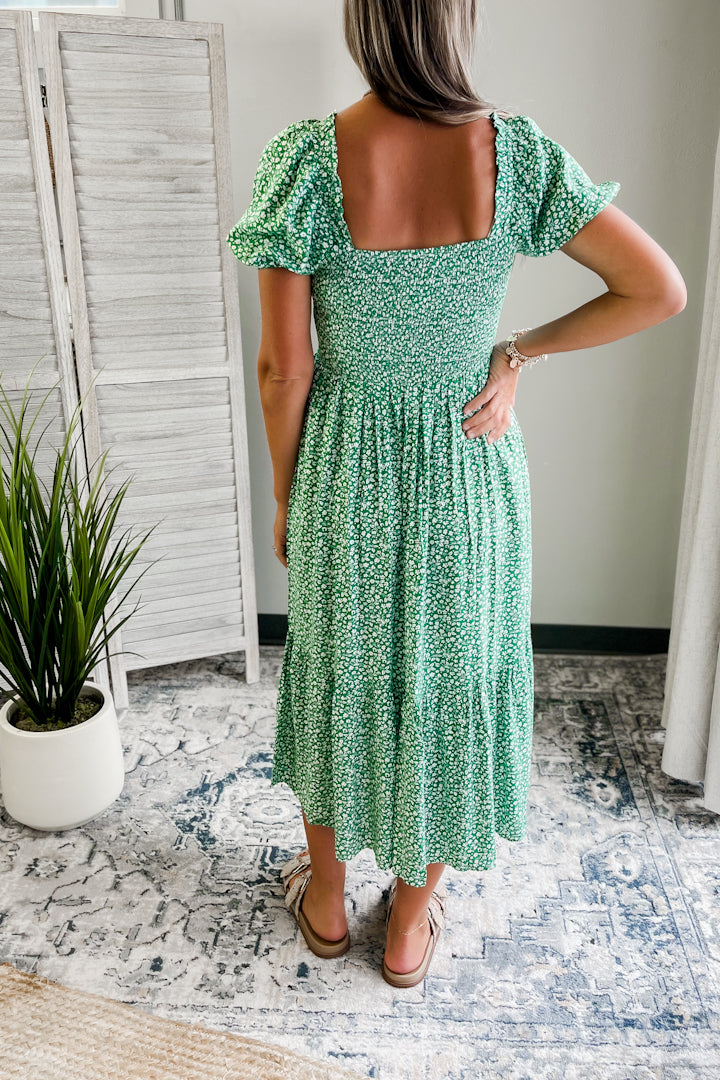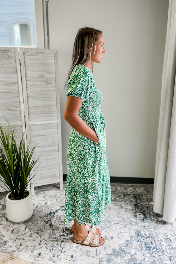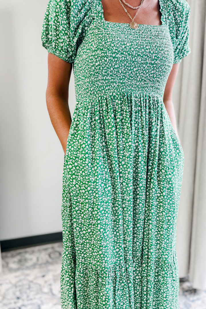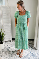This smocked dress with tier detail has a very comfortable fit and style. It has side pockets and a small floral print. This dress will transition into Fall nicely with a denim jacket styled with it and ankle boots.
