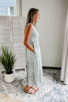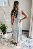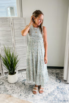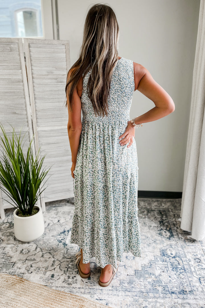 This sleeveless dress features a smocked chest, a tiered skirt with a small floral print. Light weight and easy to style with a cardigan to a jacket for Fall.