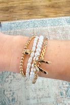 Slip on sophistication with our Bow Pearl Rhinestone Bar Stretch Bangle Set!