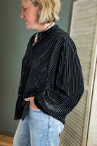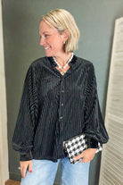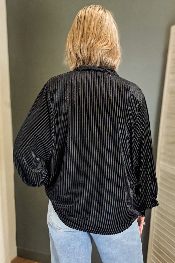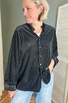 This luxurious piece features sumptuous velvet fabric adorned with elegant stripes, creating a sophisticated look that transitions seamlessly from day to evening. The band neck and long sleeves with buttoned cuffs add refined structure, while the classic button-down silhouette ensures timeless versatility. Whether you're dressing up for a special occasion or elevating your everyday style, this blouse offers the perfect blend of comfort and elegance to help you feel confident and polished.