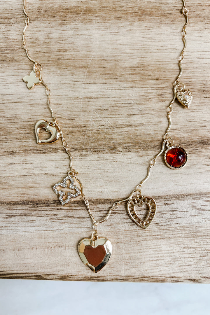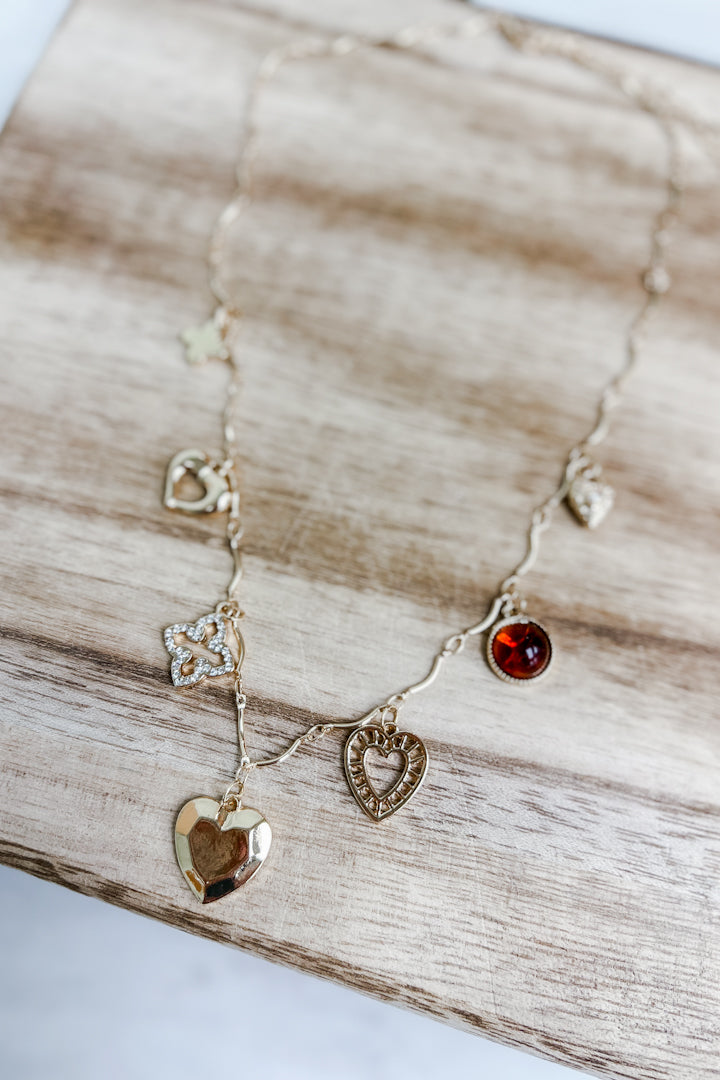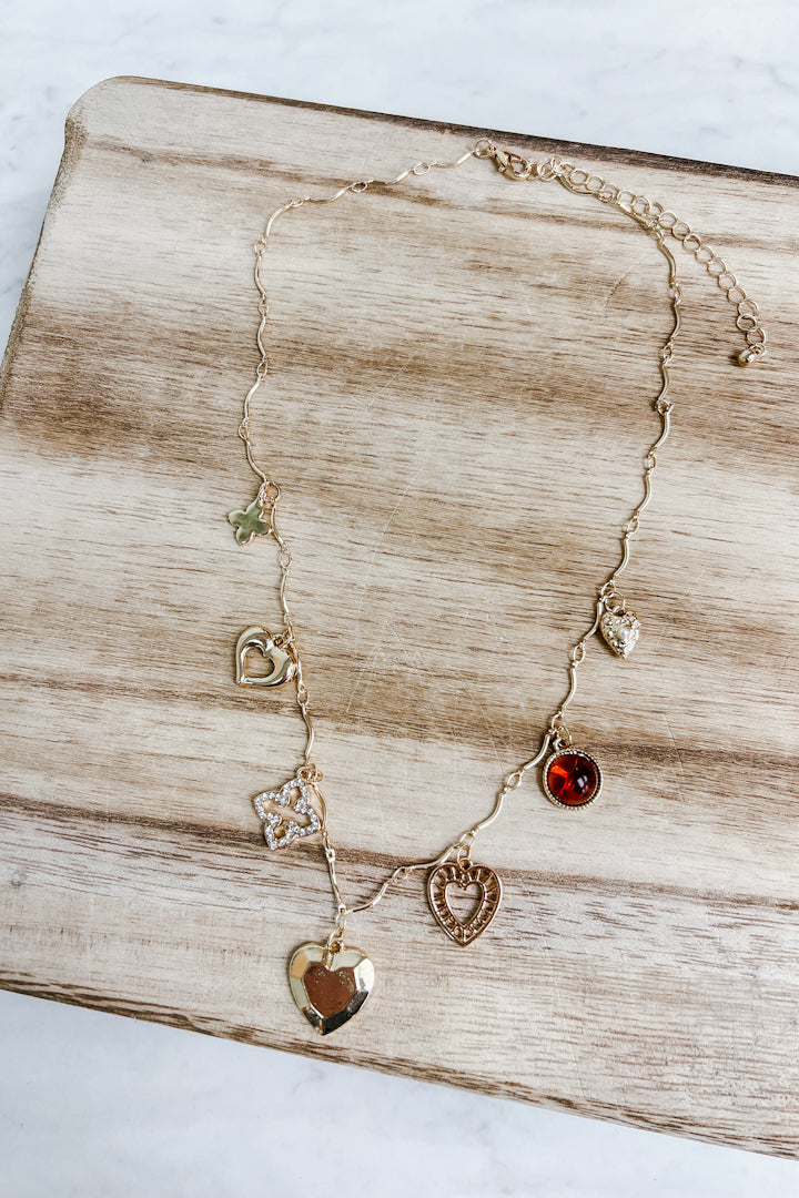 Delicate charm necklace featuring a slender bar-link chain adorned with six whimsical charms: a lucky clover, open heart, pearl-embellished heart, warm amber gem, puffed heart, and lattice heart. The adjustable clasp ensures the perfect fit for any wrist. Layer it solo or stack it with your favorites for endless styling possibilities!
