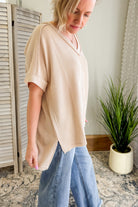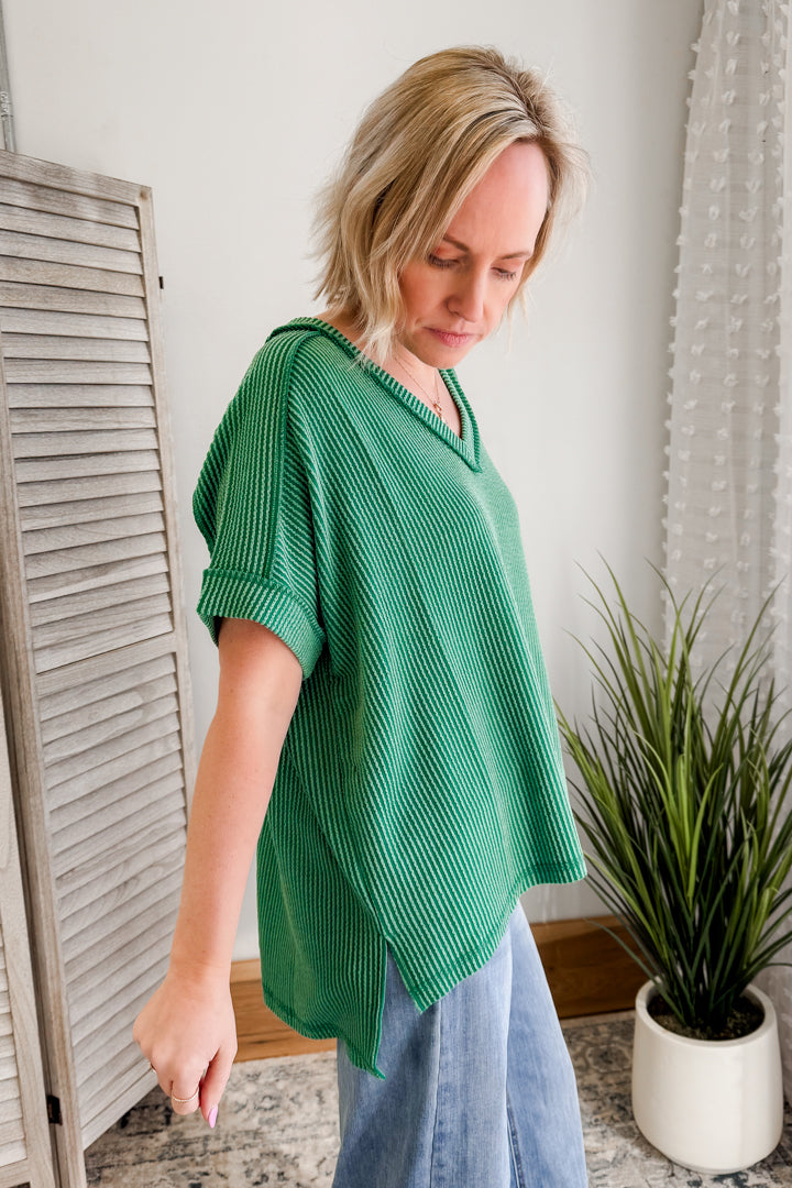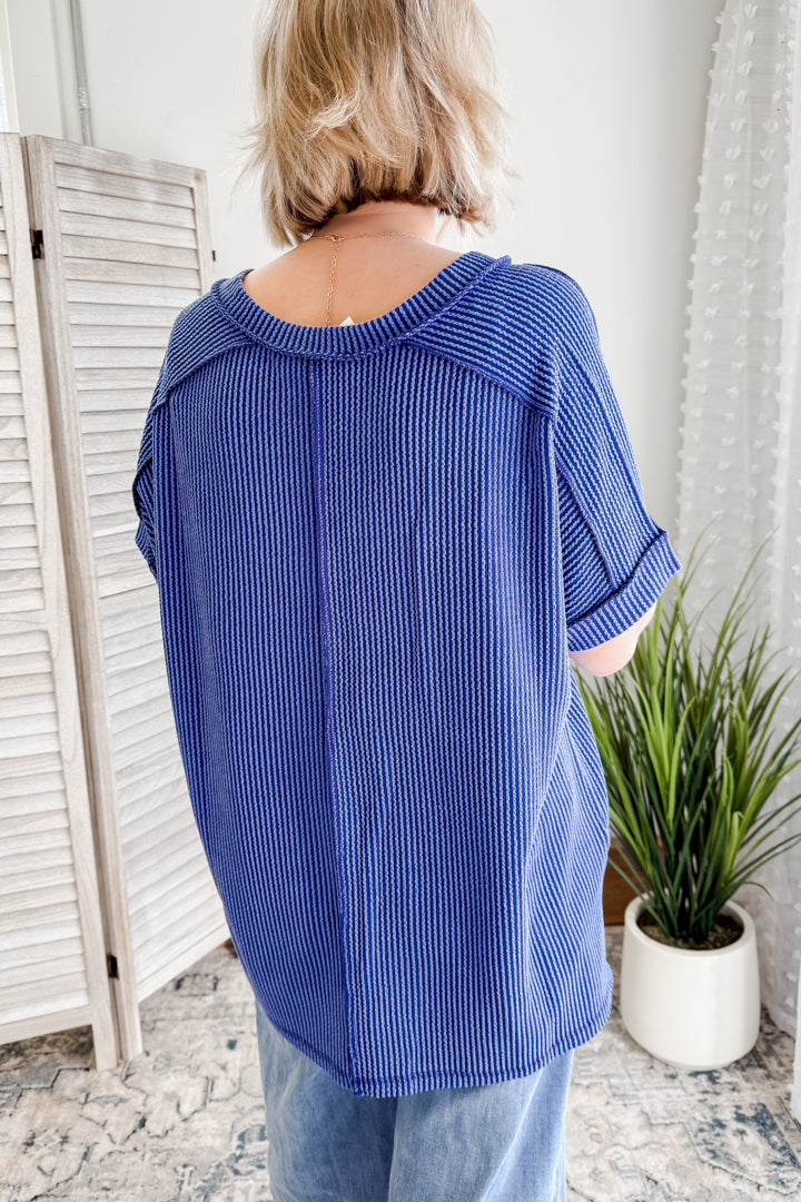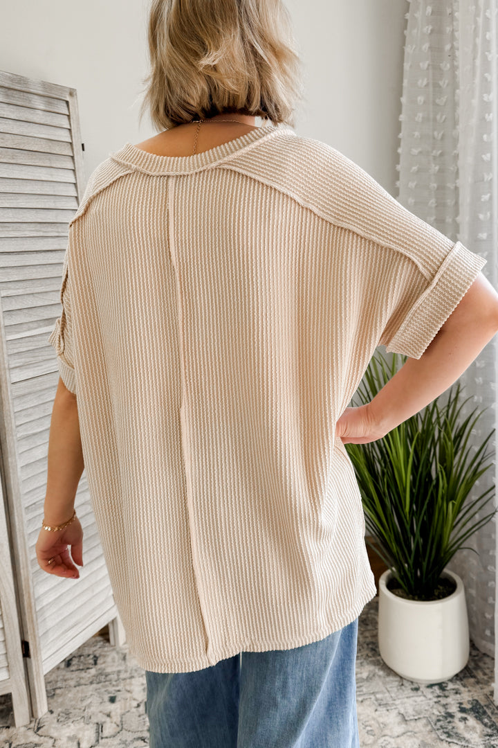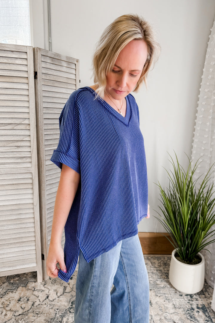 Get ready to flow in our Flowy Ribbed V-Neck Top!