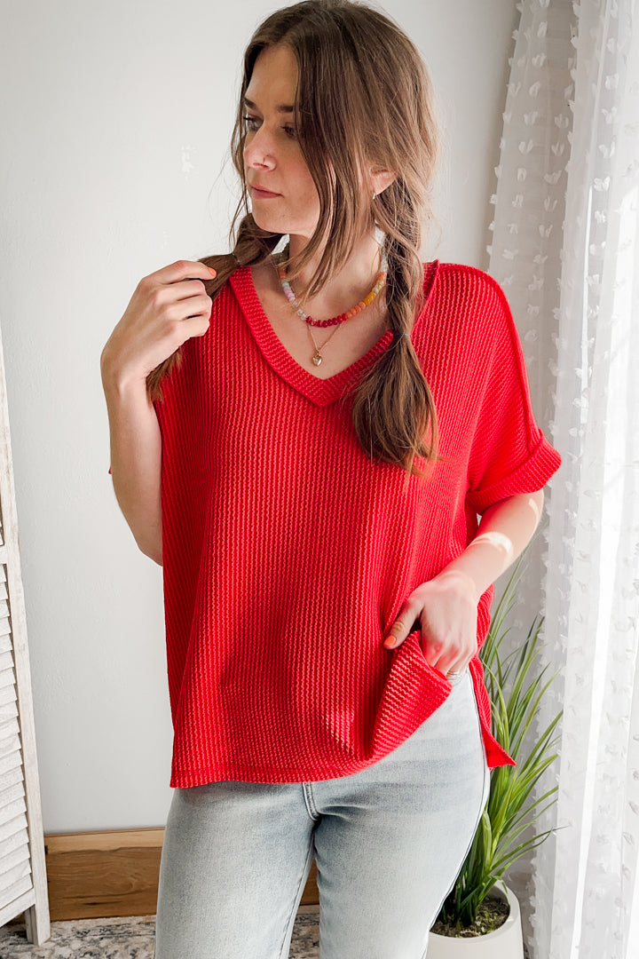 Made from a wavy corded rib knit, this top features a relaxed fit, fashionable high-low hemline, and V-neck. Perfect for a casual day out or a night on the town!