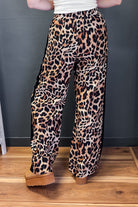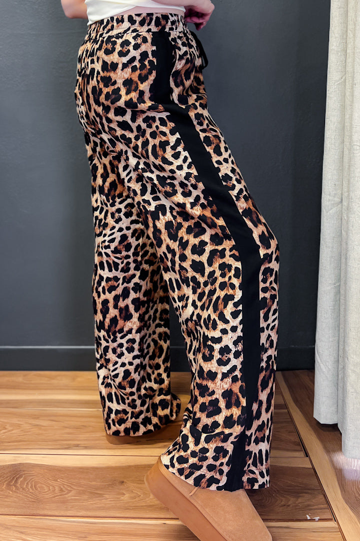 Featuring an eye-catching leopard print paired with sleek black side stripes, these pants deliver serious style points. The comfortable elastic waistband with contrasting drawstring keeps you secure all day, while two handy side hip pockets add practical flair. Cut in a flattering straight leg silhouette, they're the perfect piece to elevate your everyday look with a touch of wild confidence.