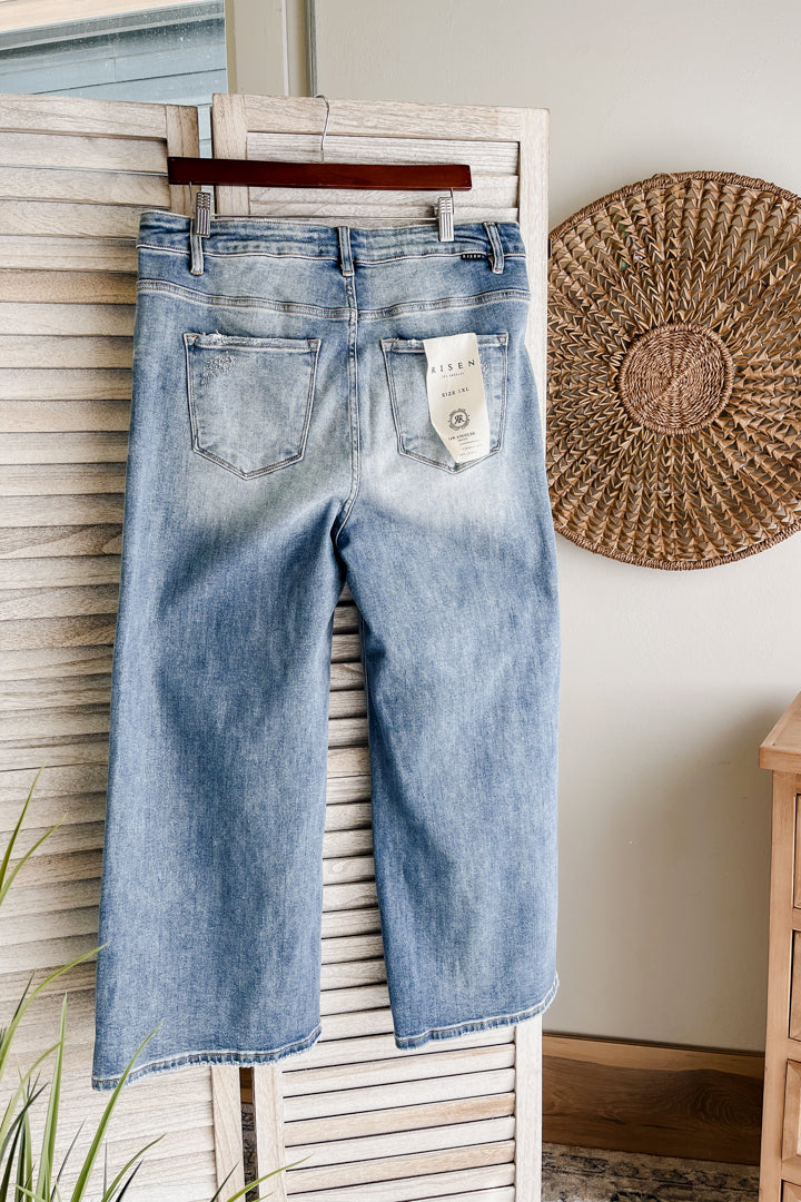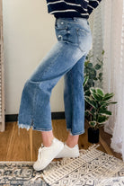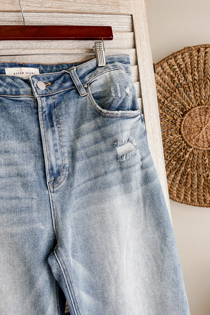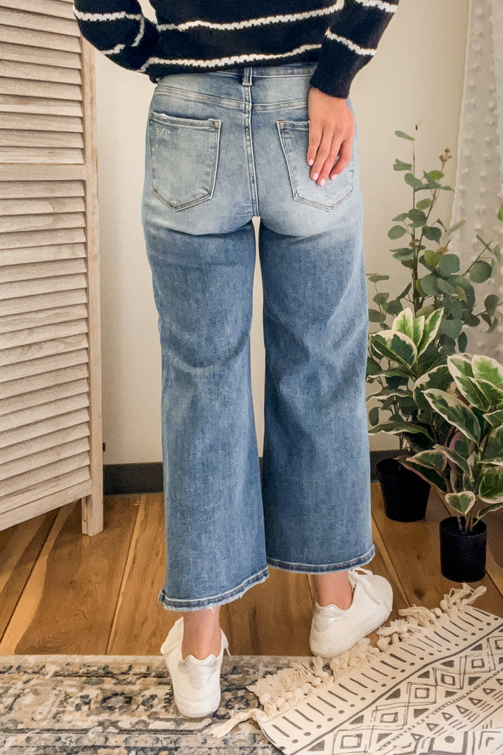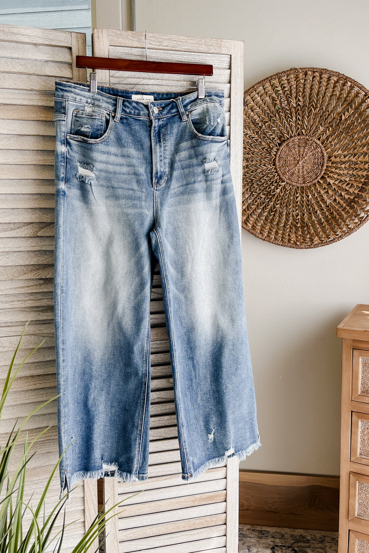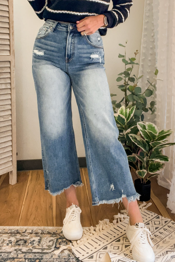 With a high rise for a flattering fit and side slits for a touch of fun, these jeans are perfect for any occasion. The frayed hems add an edgy touch to the wide leg design. Who says jeans have to be boring?
