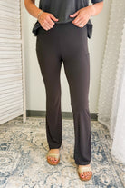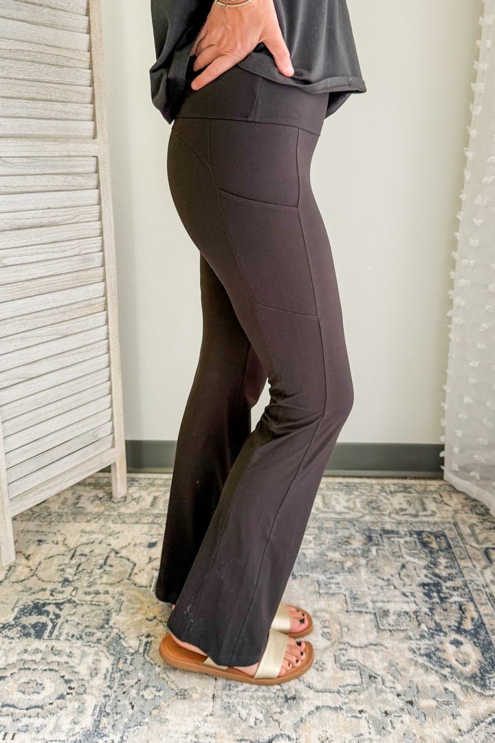 A pull on flared legging with side pockets for women.
