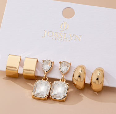 Elevate your ear game with this versatile three-pair gold-tone earring set. Mix sleek square studs with polished crescent-shaped huggies and sparkling pear-cut clear crystal drops for endless styling possibilities. Whether you're stacking them together or wearing each pair solo, this trio is minimal yet elevated together.