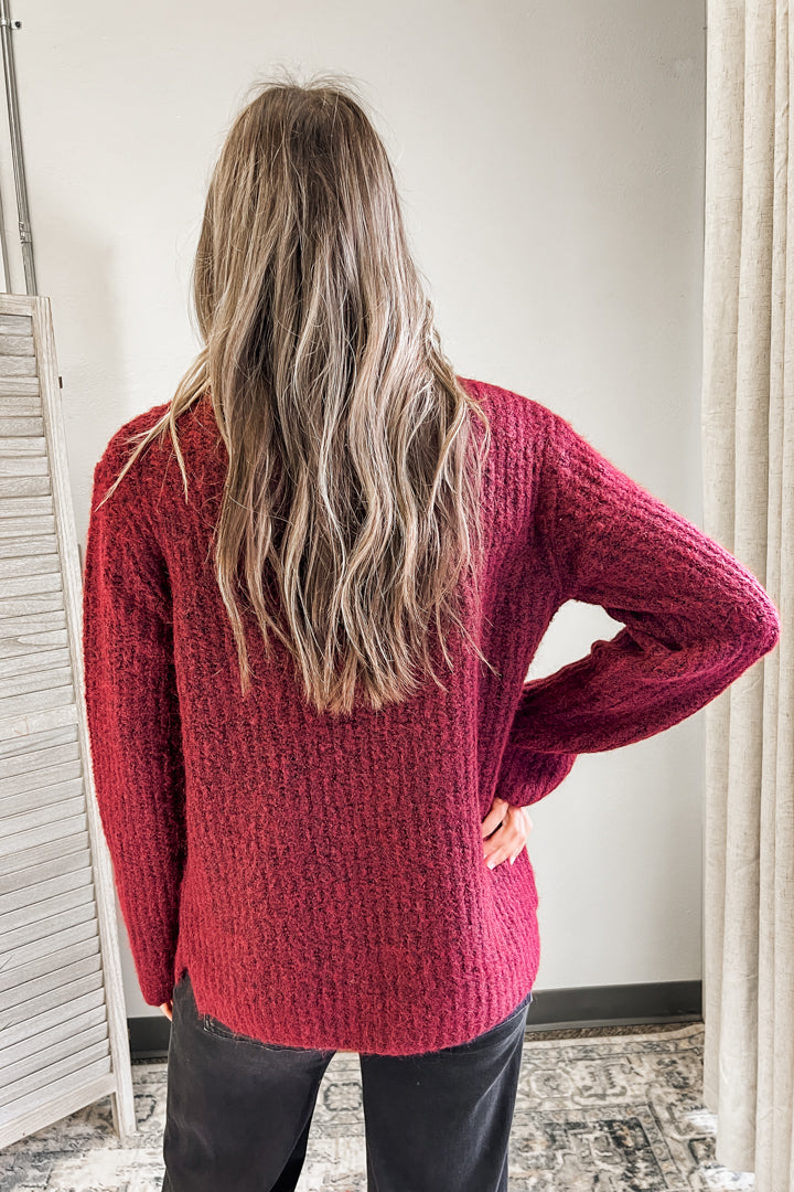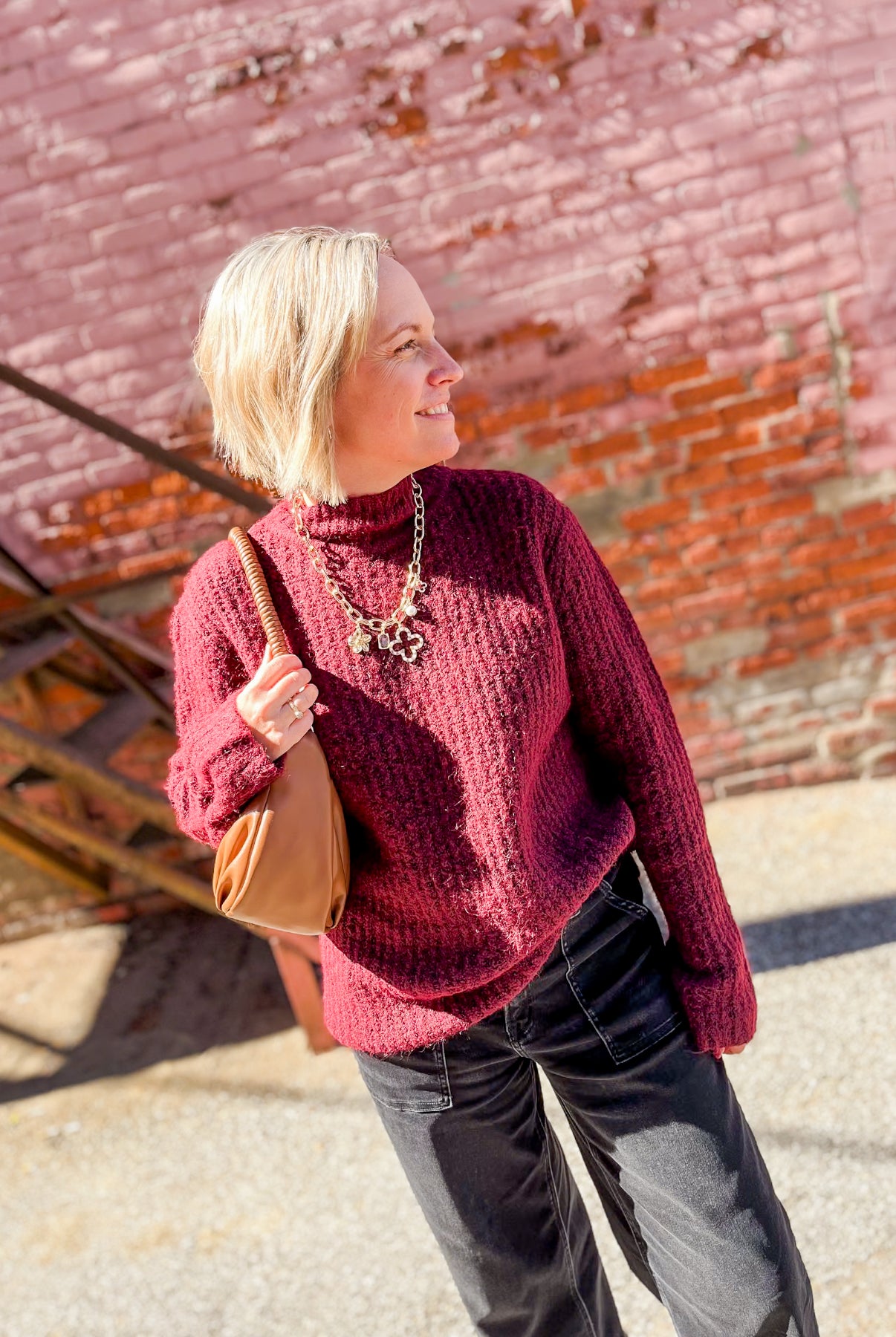 Crafted from warm knit fabric with a snug mock neck to keep chills at bay. Its rich burgundy hue adds a pop of color to your fall and winter wardrobe, making comfort and style your new favorite combo. Perfect for layering or wearing on its own for an effortlessly chic look.