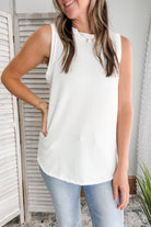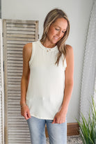 The sleeveless design and round neck with band offer ultimate comfort, while the solid ribbed fabric and stitch detail add urban flair. With a chic round hem, this tank is perfect for any casual outing.