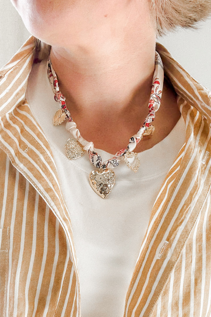 Add a touch of whimsy to your look with the Heart Star Fabric Necklace. Featuring a charming gold heart pendant paired with a soft floral scarf, this playful accessory brings a fresh and flirty vibe to any outfit.