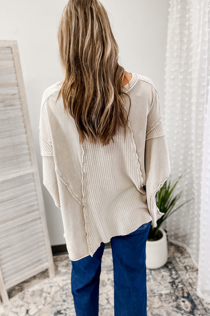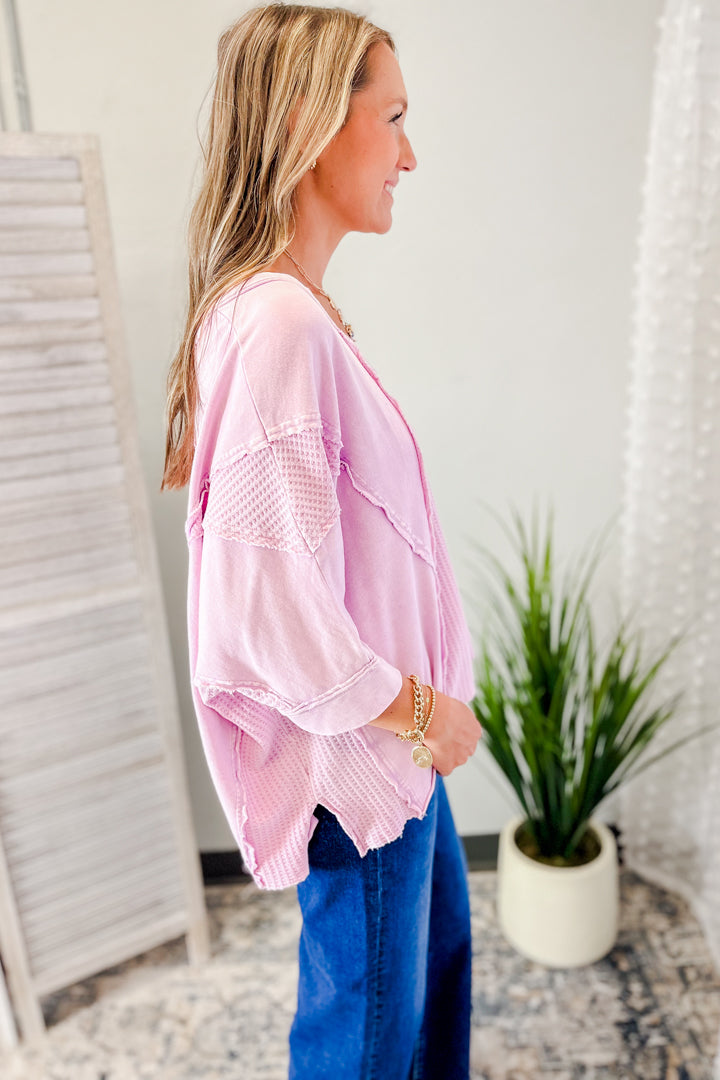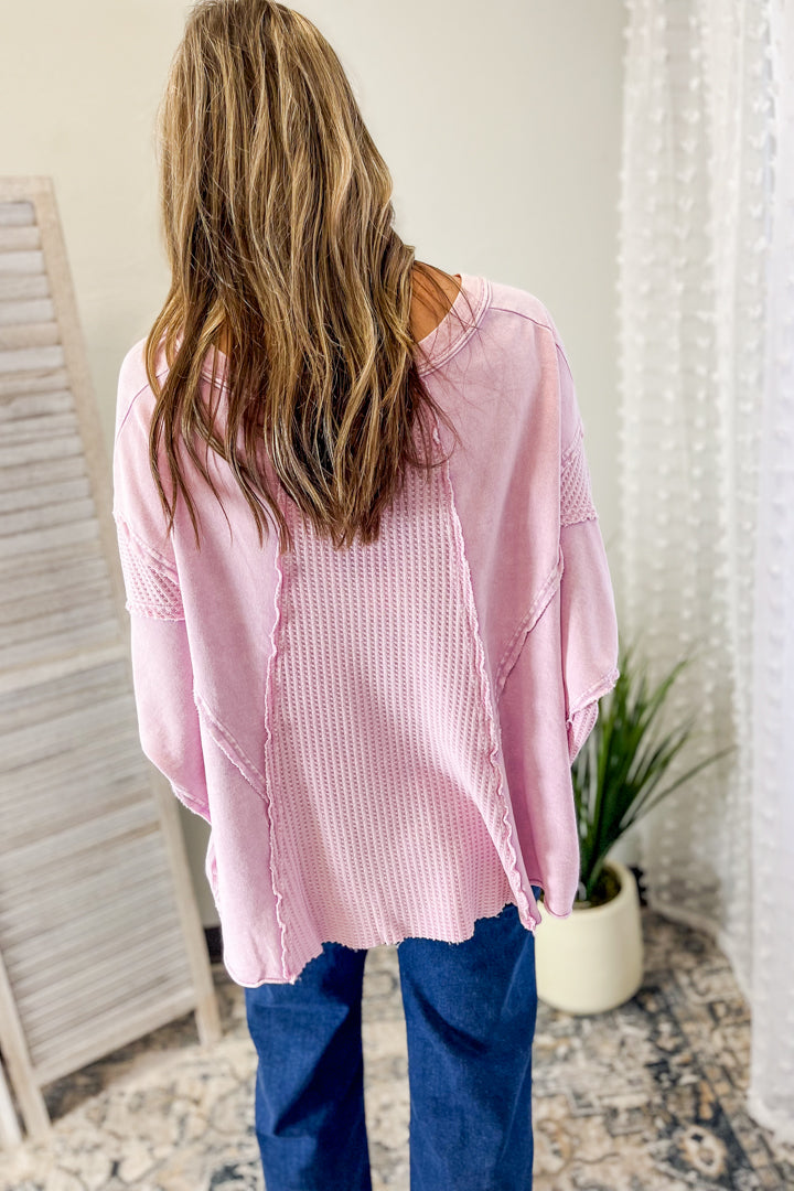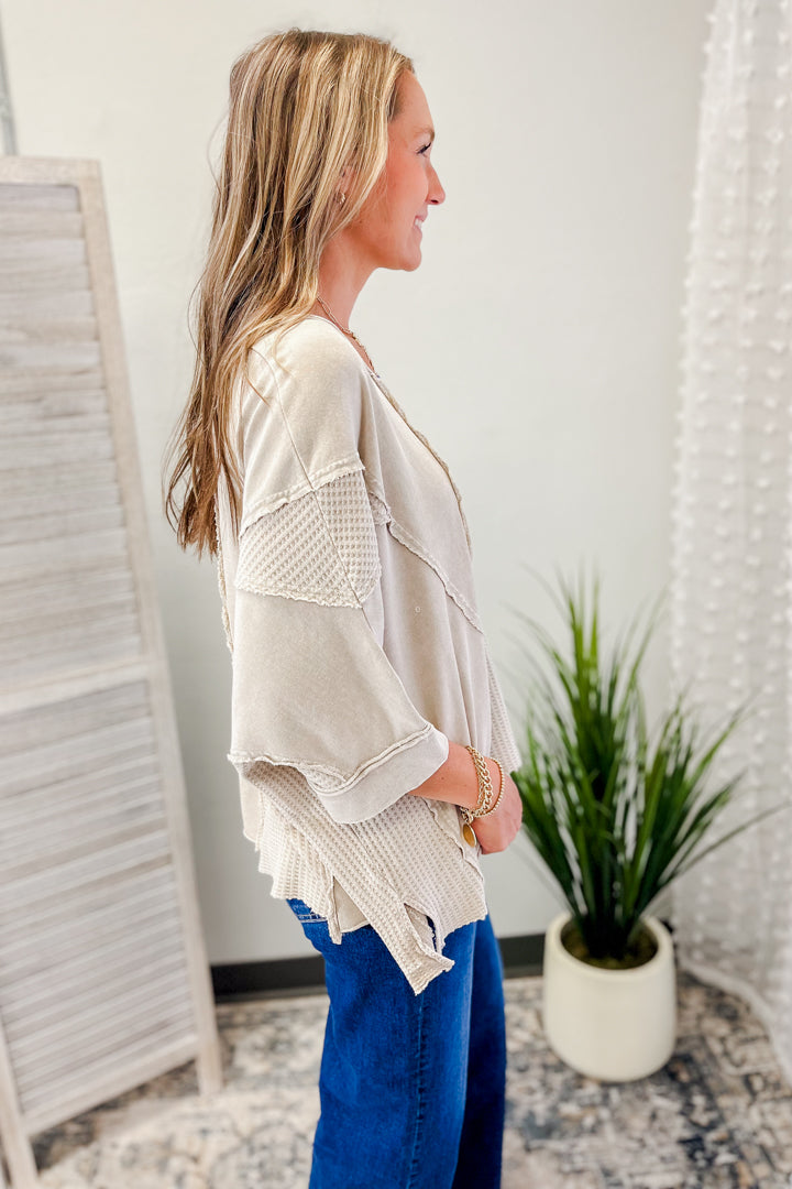 This playful thermal terry knit features a flirty deep V-neckline and trendy poncho half sleeves that perfectly complement its dropped shoulders. The mineral wash gives it that lived-in vibe, while patchwork thermal detailing adds unexpected texture. With side slits and raw-cut edges, this relaxed fit top is your new go-to for effortless cool.