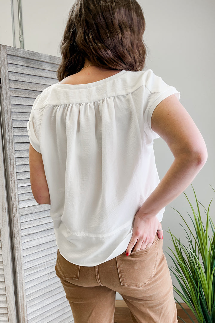 Women's short sleeve flowy top with smocked detail at neckline.