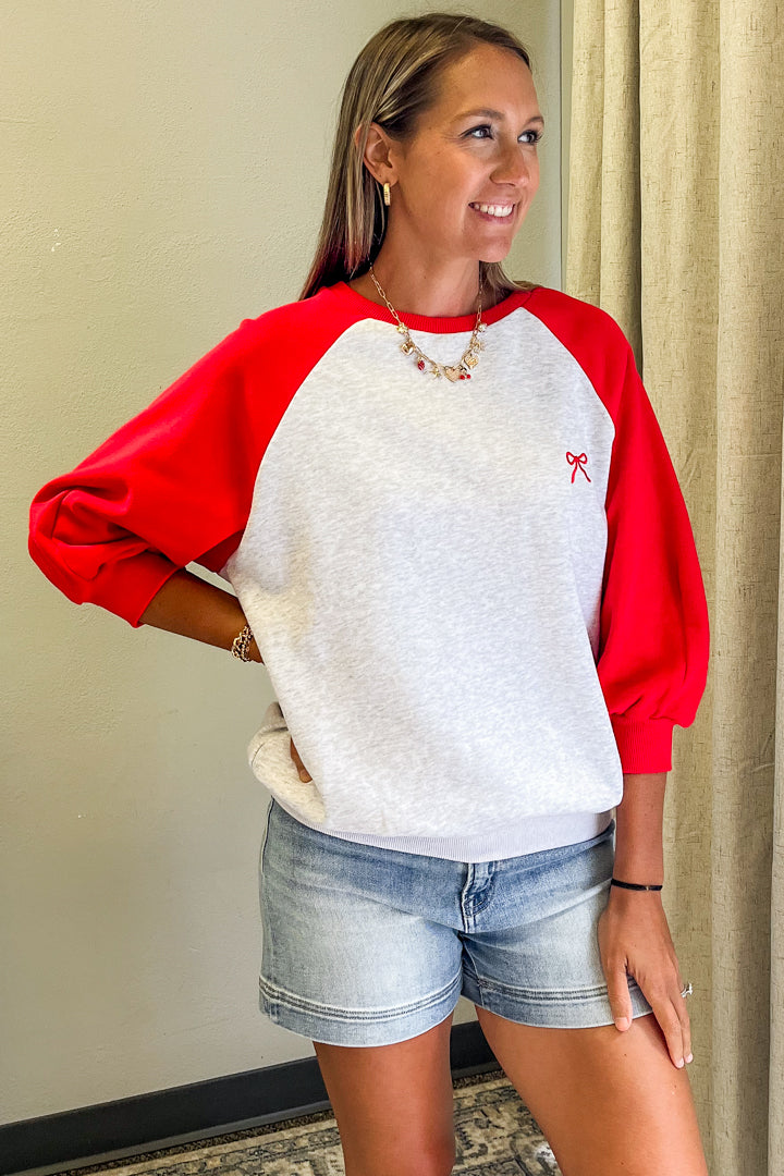 This soft heather pullover features fun raglan sleeves and a tiny embroidered bow on the chest for a playful twist. Its roomy, relaxed fit makes it perfect for lounging or styling with skirts and jeans. Sporty meets sweet in this must-have sweatshirt that keeps your look effortlessly charming and comfy all day long.